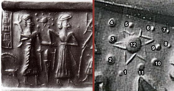 El único error de Sitchin es que, en su afán de probar que estos círculos representan a los planetas del Sistema Solar, no contempla la posibilidad más adecuada. Según Sitchin la Tierra es el circulo identificado como número 6. Nosotros proponemos, como se aprecia en la ilustración, que la Tierra es el circulo identificado con el número 9. Comenzando desde el punto que esta más abajo y siguiendo por izquierda tenemos 1. Urano, 2. Saturno, 3. Jupiter, 4. Nibiru, 5. Marte, 6.Mercurio, 7.Pluton, 8. Luna, 9. Tierra, 10. Venus, 11. Neptuno. 12, Sol. De esta manera, la Luna (8) esta más cerca de la Tierra (9), Plutón(7) es el más alejado del Sol, y Mercurio (6) es más pequeño que la Tierra.