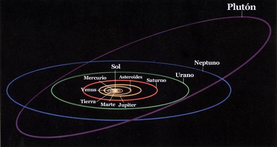 En esta ilustración podemos apreciar como la orbita de Plutón no está en el mismo plano de las orbitas de los ocho planetas del Sistema Solar.