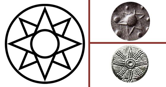 A la izquierda la representación de Ishtar (una estrella de 8 puntas encerrada en un circulo). A la derecha arriba, el símbolo que aparece en el cilindro-sello VA243. A la derecha abajo, el símbolo del dios Utu/Shamash.