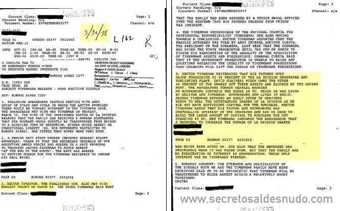 1. Héctor Timerman (23 años), agradeció a la embajada por las expresiones del departamento (de estado de USA) concernientes a su padre, Jacobo Timerman, de las cuales fue informado que han sido transmitidas al Gobierno Argentino ¨informalmente por canales diplomáticos¨.