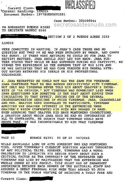 “Jara lamentó no poder decir lo mismo de Timerman. Jara confirmó que ha roto definitivamente con Timerman, no solamente porque Timerman nunca le dijo de la participación de Graiver en La Opinión sino que Timerman directamente le ha mentido cuando Jara le cuestionó en el pasado sobre rumores que entonces circulaban en tal sentido.”