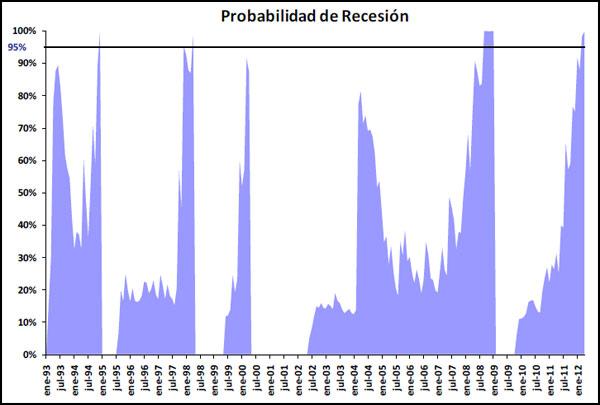 Históricamente, siempre que esta probabilidad ha superado el límite del 95% el país ha ingresado en recesión en algún momento de los siguientes seis meses.