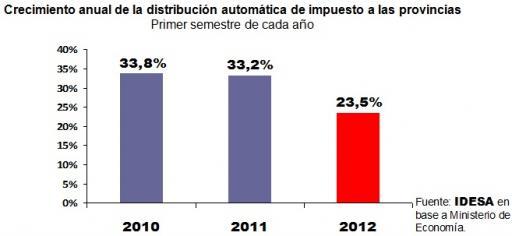 - En los primeros 6 meses del año 2012, el crecimiento de los recursos nacionales transferidos automáticamente a las provincias cayó a un tasa del 24% interanual.