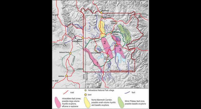 Mapa del área de Yellowstone muestra hipótesis de focos de vulcanismo futuro en relación con la infraestructura principal.