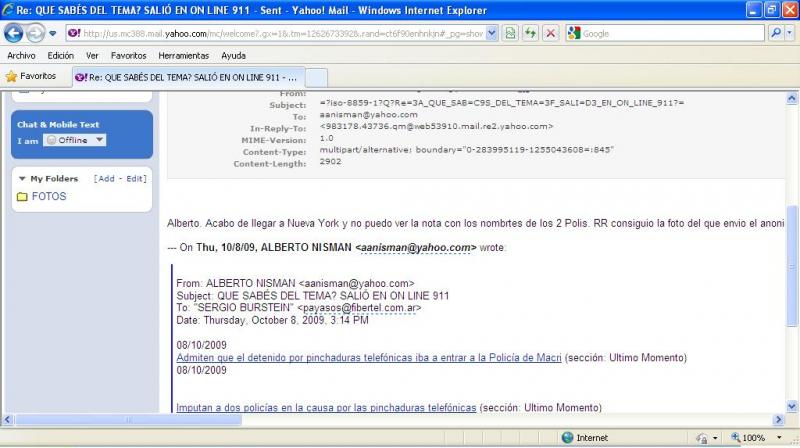 Casi me olvidaba, se perfectamente como operaron la SI contra Mauricio Macri, y como traicionaron al propio Ciro James. Y hasta las comunicaciones entre Burstein y Nissman en la causa de las escuchas ilegales. Esos email los intercepto la propia SIDE, y este periodista tiene esas comunicaciones que serán llevadas a la Justicia lo cual comprometen a Nissman, Burstein y un periodista oficialista.