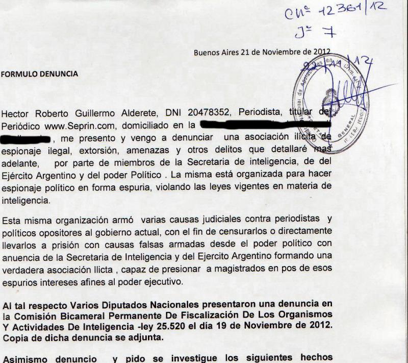 Con el número 12361/12 en el Juzgado Nro7 a cargo del Dr. Sebastián Casarello en el día de la fecha se presentó una denuncia por asociación ilícita, donde el aparato del gobierno se pone en evidencia en una verdadera Gestapo. Donde están implicados desde militares del Ejercito Argentino , Agentes de inteligencia , funcionarios nacionales hasta periodistas , en una red de espionaje montada en los albores del kirchenrismo cuyo fin es la persecución de opositores en todos los ámbitos.