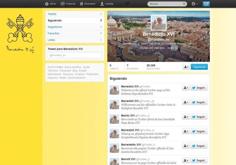 El 12 de diciembre, fiesta de la Virgen de Guadalupe, el Santo Padre Benedicto XVI emitirá su primer tuit, así se informó hoy en una conferencia de prensa en el Vaticano donde se lanzó la cuenta oficial de Twitter del Papa. Los tuits del Papa serán en ocho idiomas: inglés, italiano, portugués, alemán, polaco, árabe, francés y español. En este último idioma el usuario del Santo Padre es @pontifex_es. No se descarta que en el futuro se añadan más idiomas.