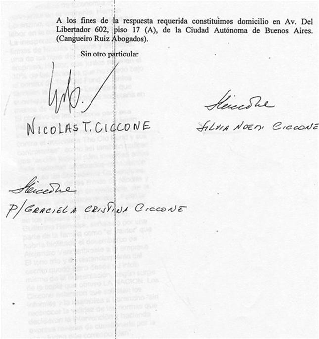 El tono frío y distante del escrito queda claro desde el inicio mismo del documento, según surge de la copia que obtuvo LA NACION. Los Ciccone aclararon que solicitan los informes y la asamblea a Lorenzino ¨sin reconocer la validez de las normas que decidieron la intervención y haciendo expresa reserva de cuestionarla por la vía y forma que correspondan¨.