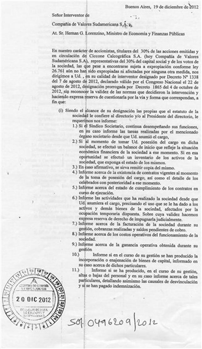 Los Ciccone también anticiparon qué posición tomarán si Lorenzino no les responde el cuestionario: ¨Dará lugar a que se solicite judicialmente, sin perjuicio de la información que se le requerirá al juez del concurso¨, es decir, al juez Javier Cosentino. Esto marcaría la voluntad no sólo de solicitar información al Estado, sino también de avanzar judicialmente, si hiciera falta.