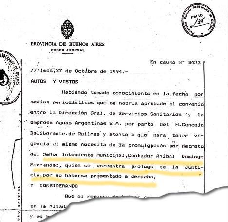El año que comenzó con un escándalo terminó con otro: una controversia con Aguas Argentinas en la que la empresa le reclamaba al municipio deudas impagas por 400.000 pesos. Aquel conflicto fue el origen de la fuga del intendente: en octubre de 1994, la concejala del Frente Grande María del Carmen Alburúa denunció a la Dirección General de Servicios Sanitarios por haber contratado a un grupo de abogados ajenos al organismo para llevar adelante las negociaciones con el Ente Regulador de Aguas: la designación del estudio había sido autorizada por medio de un decreto firmado por el intendente. El 27 de octubre de ese año, el diario El Sol informó que serían detenidos el intendente Fernández y dos secretarios. La orden de detención fue librada por el juez en lo Criminal y Correccional de Quilmes Ariel González Elicabe. Los abogados de Aníbal, Domínguez, Ordoqui y María del Carmen Falbo –hoy procuradora de la Suprema Corte bonaerense–, argumentaron que su fuga estaba basada en la falta de garantías de ecuanimidad para que se produjeran las presentaciones. Aníbal Fernández, por su parte, insistía con que no había delito: “Nunca me llamaron a declarar. Me mandaron a detener sin saber qué condición tengo. No estoy imputado ni procesado”. El 17 de diciembre, la Cámara decidió aprobar la recusación del juez Elicabe.