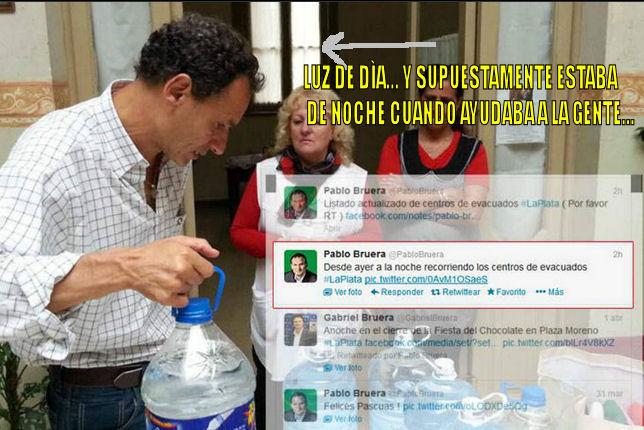 El tuit del Intendente Dijo: Desde ayer a la noche recorriendo los centros de evacuados, escribió Bruera el miércoles por la mañana. Sin embargo, el funcionario no recorrió los centros de evacuados como decía ya que arribó al país a las 9:25 am de ayer proveniente de Río de Janeiro, Brasil.