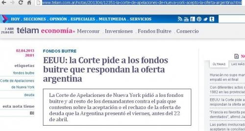 En un mar de información, y en una jornada más que difícil, el tuit de Alicia parecía pasar inadvertido, aunque el mismo estaba basado en una noticia de la agencia estatal Télam, que con esos mismos datos tituló en la portada de su sitio web: “La Corte de Apelaciones de Nueva York aceptó la oferta argentina”.