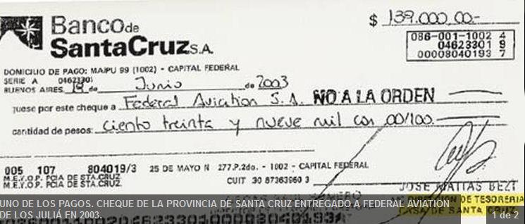 UNO DE LOS PAGOS. CHEQUE DE LA PROVINCIA DE SANTA CRUZ ENTREGADO A FEDERAL AVIATION DE LOS JULIA EN 2003