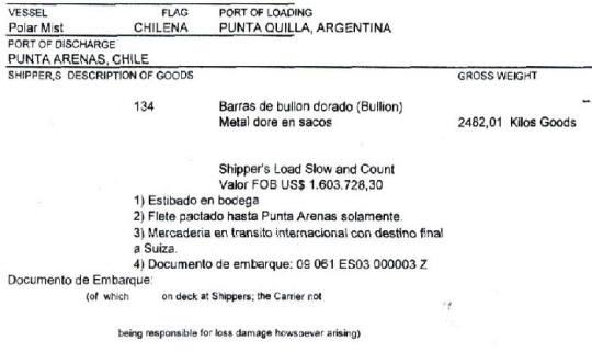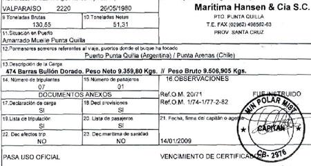 El Polar Mist —propiedad de la firma pesquera con base en Chile, Isla del Rey— zarpó de Punta Quilla, en la ciudad argentina de Santa Cruz. El parte de embarque asegura que en su interior iban bolsas de “bullion doré”, una manera técnica para designar lingotes con contenido aurífero. Como valor de la carga, el documento entregado a la Aduana transandina asegura que alcanza US$ 1,6 millón y se afirma que el cargamento es de 2,9 toneladas. Ambas cifras serían rectificadas luego del naufragio, cuando se conoció la magnitud y valor de lo que llevaba el pesquero.