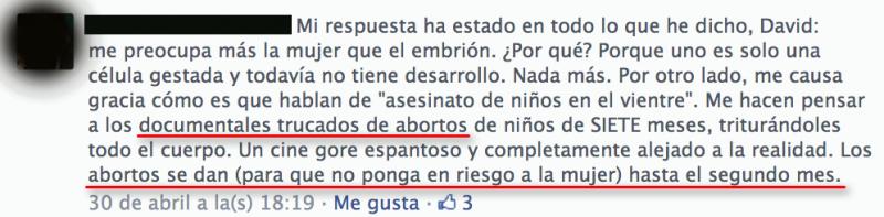 Documentales trucados de abortos de niños de siete meses, asegura esta joven, para poco más lanzar una frase más avezada: los abortos se dan (para que no ponga en riesgo a la mujer) hasta el segundo mes.