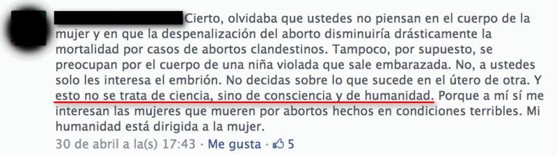 Descontando que ya la falsa relación entre prohibición del aborto y mortalidad materna ha sido desmentida científicamente hasta el cansancio ( Ver:http://www.aciprensa.com/noticias/estudio-prohibicion-del-aborto-no-aumenta-mortalidad-materna/#.UZ0ZIqLV4xI ), ella dice que esto (el aborto) no se trata de ciencia, sino de consciencia y de humanidad. Bien, este es un asunto terrible: Es desastroso, humanamente hablando que alguien asegure que defender al ser humano no es un asunto de ciencia.