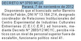 Días atrás se pudo conocer a través del Sitio Rio Bravo que Barreiro fue nombrado por el gobierno de Entre Rios Coordinador de Relaciones Institucionales del Centro Experimental de Industrias Culturales Entrerrianas (C.E.I.C.E.R.) ad honorem, mediante Decreto N° 2693/12 MCYC, pero que perciba viáticos con un nivel de personal superior fuera de escalafón, funcionario político nivel 41.” El decreto por el cual Ricardo Barreiro es designado es del 15 de agosto de 2012. El nombramiento se publicó en el boletín oficial de la provincia de Entre Ríos el jueves 13 de diciembre de 2012 (N°25.125, 232/12).