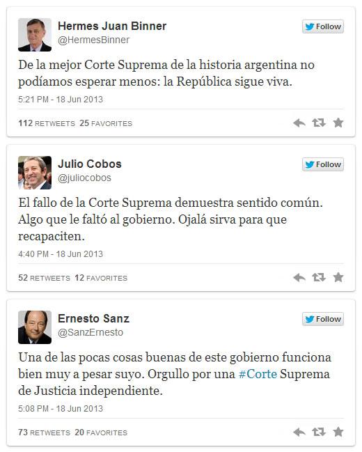 El diputado nacional y jefe de bloque Pro, Federico Pinedo, celebró la decisión de la Corte, destacando que ¨fortalece la democracia y la relación que debe existir entre la democracia y el Estado de Derecho¨. ¨Hoy los magistrados frenaron el avasallamiento del Poder Ejecutivo contra la Justicia, afianzando la idea de que es imprescindible que los jueces sean jueces de la ley y no jueces del poder¨, dijo.