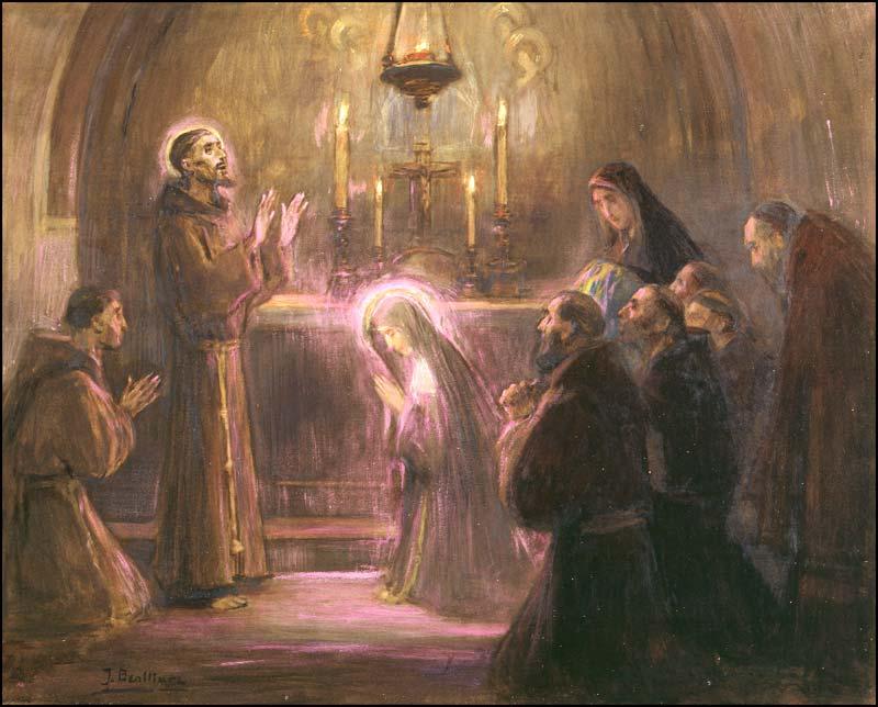 Esto mismo parece querer subrayar también San Buenaventura cuando dice: «Mientras moraba en la iglesia de la Virgen, Madre de Dios, su siervo Francisco insistía, con continuos gemidos ante aquella que engendró al Verbo lleno de gracia y de verdad, en que se dignara ser su abogada, y al fin logró -por los méritos de la madre de misericordia- concebir y dar a luz el espíritu de la verdad evangélica» (LM 3,1).