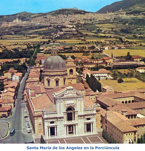 En la verde llanura umbriana, en el corazón de la pequeña ciudad de Santa María de los Angeles, se alza el inmenso templo de la Basílica de la Porciúncula, del siglo XVI. Esta Basílica nos introduce en el corazón de Francisco y en el misterio mismo de la ciudad seráfica: «En las puertas de Asís está la representación de los bienaventurados espíritus, los ángeles, que están en la presencia de la Santísima Trinidad y forman una corona en torno a la Madre de Dios... oh María, Reina de los Ángeles, desde aquí nos muestras el camino del paraíso» (Juan XXIII).