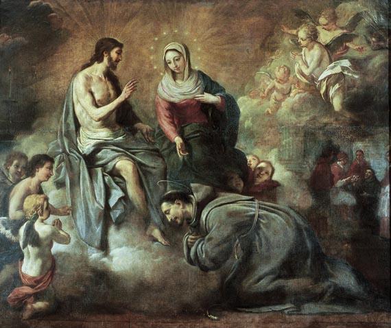 En lo alto está la grandiosa escena de la aparición de Cristo y de la Virgen (rodeados por unos 60 ángeles) al Santo arrodillado ante el altar de la Porciúncula en acto de ofrecer una corona de rosas a Cristo y a María.