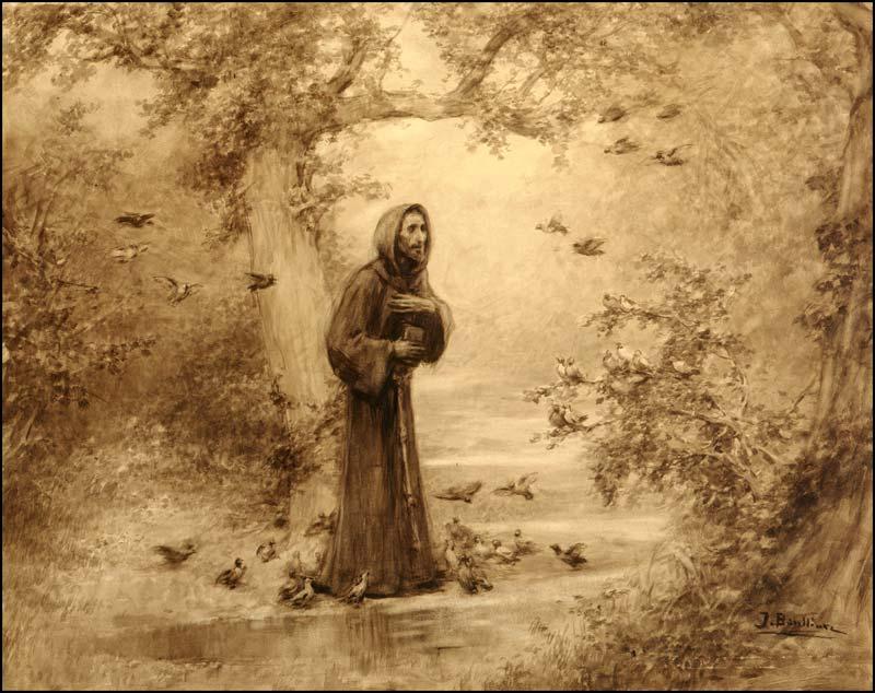 Francisco hablaba como amigo con la cigarra, con la cual durante una semana entera alternó aquí en el canto de alabanza al Señor. A su paso las ovejas corrían alegres y festivas para saludarlo, y aquí en la Porciúncula una ovejita lo seguía por doquier y balaba, asociándose a la oración de los frailes en la iglesita. El Santo invitaba a las aves a alabar y dar gracias con el vuelo y el canto a Dios providente que tiene cuidado de ellas, y éstas daban señales de festiva aprobación.