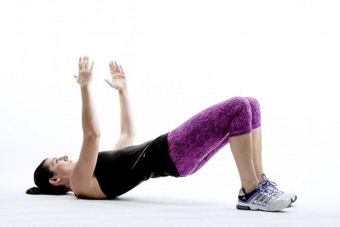 1. Acuéstese boca arriba con las rodillas dobladas y los pies en el suelo a un palmo de sus caderas. Si no tiene alfombra, acuéstese sobre una estera.