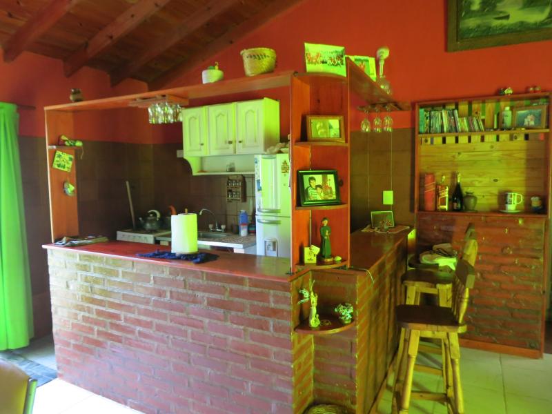 Casa: 40 metros cubiertos aproximadamente. Dos dormitorios, baño, living/cocina con dos puertas balcón, mesada y hogar a leña. Pisos de porcelanato.