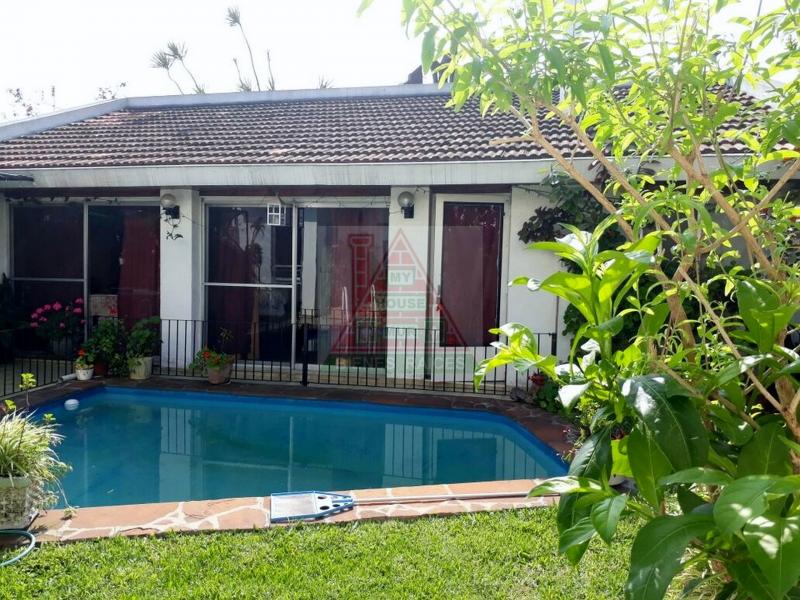 La propiedad en planta baja cuenta con: cocina-comedor (2x3m) con muebles de alto y bajo mesada y/o artefactos, comedor principal (3x3m), amplio living (8x4m) con hogar, un toilette, lavadero (2x2m), cuarto de planchado, dependencia, jardin con pileta (6x4m) y gran quincho (11x4m) con baño. En planta alta se encuentran tres dormitorios, un baño completo, un family room y balcón (11x2m).
