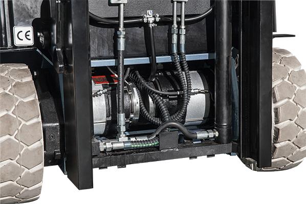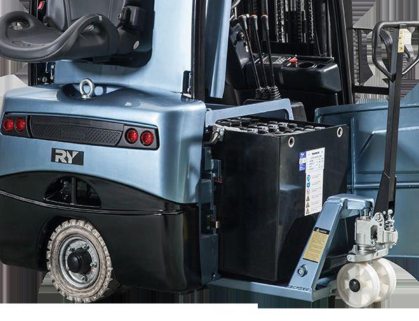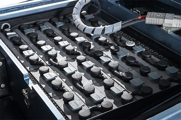 Con el diseño de cambio de batería en la puerta lateral, la batería se puede sacar fácilmente desde un lado mediante el uso de una transpaleta, apiladora o autoelevador.