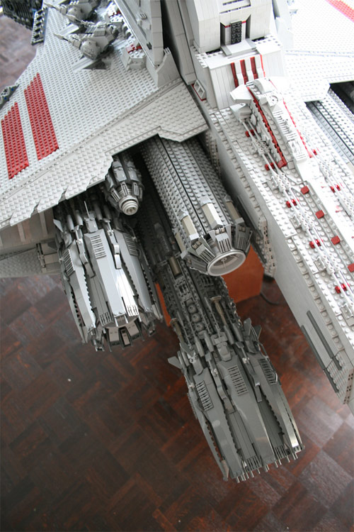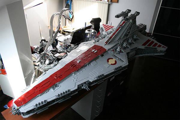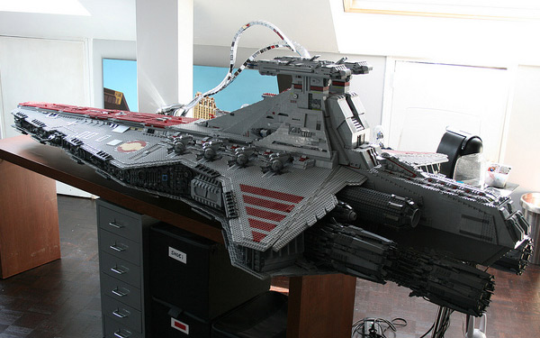 Esta nave Destructor de la Guerra de las Galaxias está hecha con nada menos que 43.000 piezas de lego, al creador le tomó 3 meses y medio terminarlo, pesa 180 libras y tiene 8 pies de largo. El resultado es realmente increible. Aquí mas fotografías: