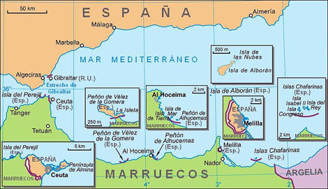 En el Casino Militar de Melilla, en el vestíbulo, hay una maqueta del Peñón de Vélez de la Gomera realizada por un ingeniero militar que detalla las construcciones apiñadas en la roca en la que llegaron a vivir hasta trescientos civiles, además de un escuadrón del Ejército Español. Vélez de la Gomera está a 126 kilómetros al oeste de Melilla y a 117 kilómetros al sudeste de Ceuta. Al igual que Alhucemas está custodiada por los Regulares. Hasta 1930 era un islote separado del continente africano. Un puente de madera unía el peñón con el peñasco de San Antonio, un islote puntiagudo donde la población ubicó el cementerio. Hoy una lengua de tierra une el peñón con territorio marroquí. La vecindad es cordial. Los soldados auxilian y ayudan a sus vecinos marroquíes cuando lo necesitan.